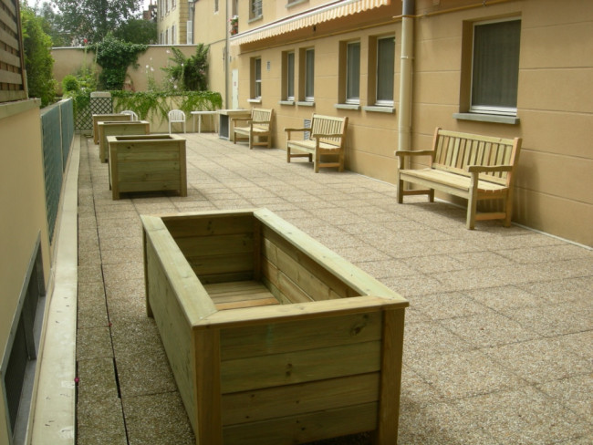 14/04/2023Installation de deux jardinières en bois contre la façade et entre les portes d’accès aux locaux