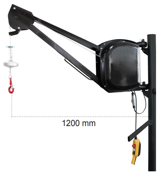- Ensemble du treuil avec flèche pivotant à 200° par rapport au support de fixation au bâtiment.