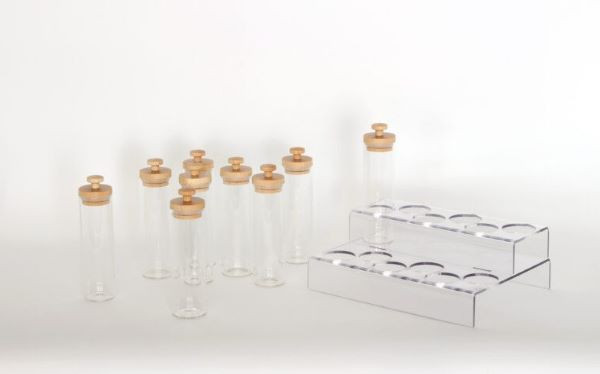 Doté de podiums modulaires et de flacons en verre avec bouchon en bois, ce présentoir à épices a une apparance attrayante et moderne, ce qui améliore l'esthétique générale d'un point de vente.