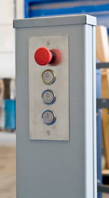 Il est équipé de plusieurs sécurités : cellule photoélectrique, bouton d'arrêt, batterie de secours et bouton d'alarme. |