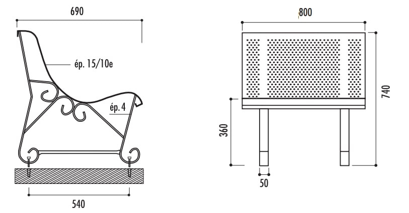Longueur : 800 mm Tôle perforée Piètement en fer plat cintré À poser ou à sceller