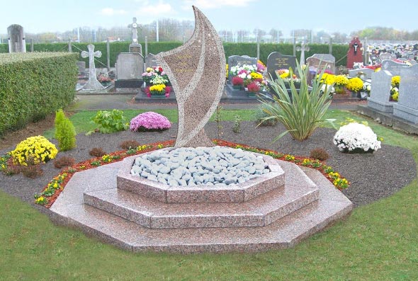 un jardin du souvenir composé : d’un puits de dispersion avec couronnement granit hexagonale diamètre 3 m de 2 bancs courbes en granit longueur 1,50 m d’une table de cérémonie en granit : dimensions en cm socle 30x30x7ep, fût 20x20x75ht, table 45x40x5ep d’une flamme granit marquée « jardin du souvenir » dimensions extérieures 105 x 85 cm