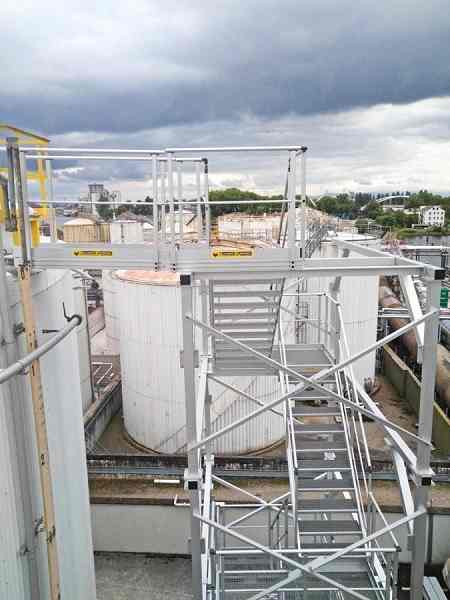 Ces passerelles d'accès sur cuveries permettent de garantir un accès sécurisé et pratique au-dessus des cuves de stockage de produits pétrochimiques.