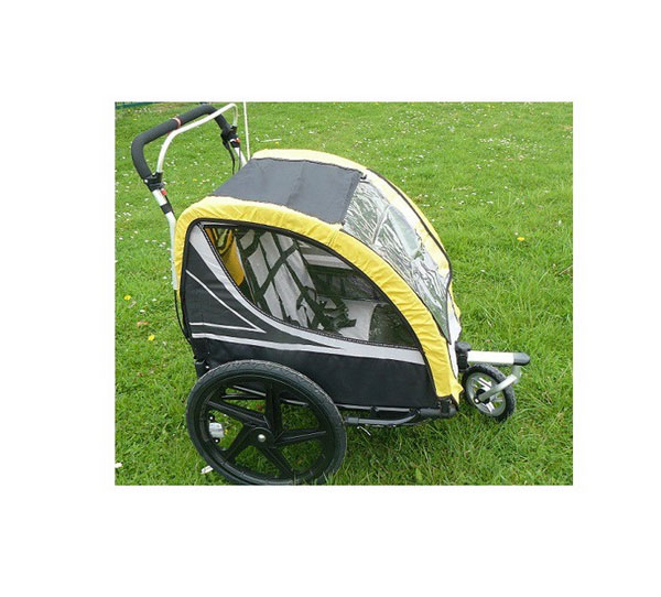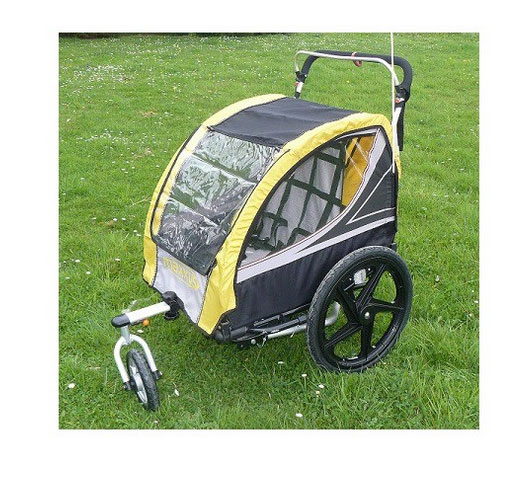 - Cette remorque peut être aussi utilisée en poussette grâce à la troisième roue placée à l'avant de la remorque. Tout est pensé pour le confort et la sécurité de vos enfants : frein, ceintures de sécurité, réflecteurs positionnés sur les roues, cadre en aluminium, tissu ventilé, toit rétractable et imperméable, espace de rangement ...