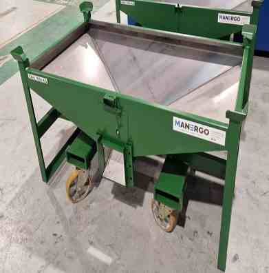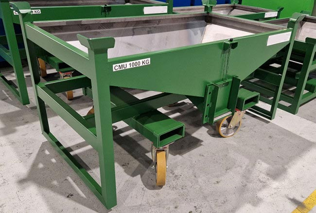 Ce conteneur auto videur avec trappe latérale et roues, permet le stockage de granulés par exemple avec un vidage pouvant être dosé grâce à sa trappe manuelle sur le dessous.