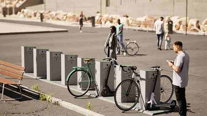 Adaptée à un usage intérieur et extérieur, la borne de recharge et station de parking permet de sécuriser et de charger à la fois les vélos et trottinettes électriques.