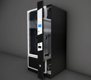 Je cherche un distributeur automatique de canettes réfrigéré pour une installation en extérieur.