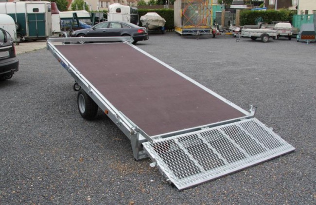 Bonjour, j"ai besoin d"une remorque porte voiture plateau 3500 kg deux essieux freinés sous plateau.(le plus bas possible) surface utile 5.5 mètres X 2.20 mètres. basculante, hayon monte charge toute la largeur(2.20 mètres).