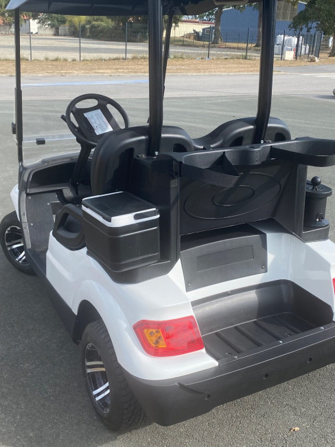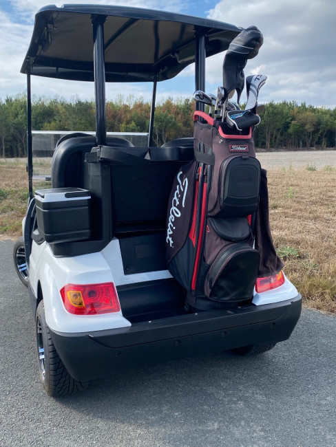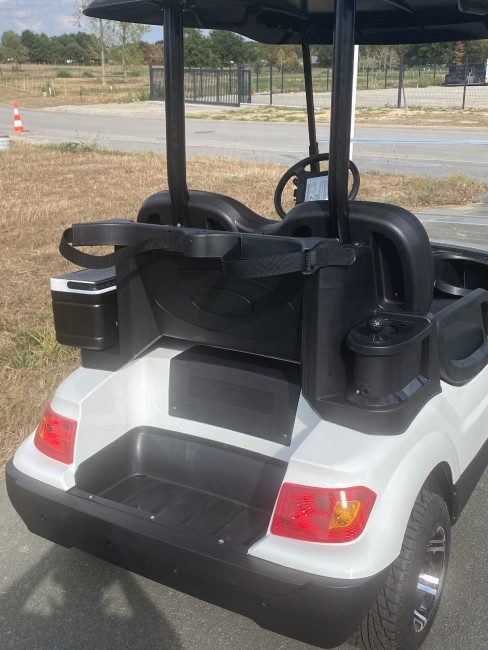 La golfette est équipée d'un chargeur embarqué, ce qui signifie que vous pouvez la brancher sur une prise 220V standard pour recharger facilement la batterie.