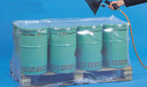 Palettiser efficacement et avec sûreté les charges lourdes. Le film se rétracte à la chaleur à l'aide d'un pistolet à chaud.