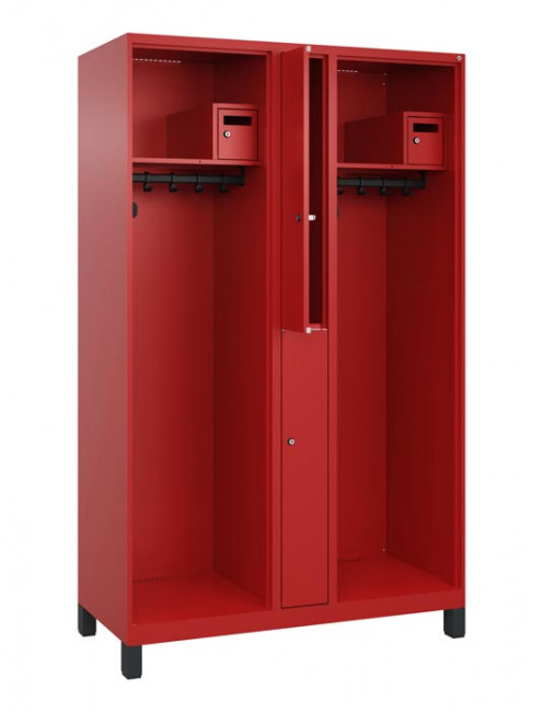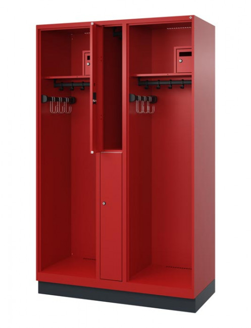 Il permet à deux utilisateurs de ranger séparément leurs vêtements privés et professionnels, conformément à la norme DIN 14092 / DGUV.