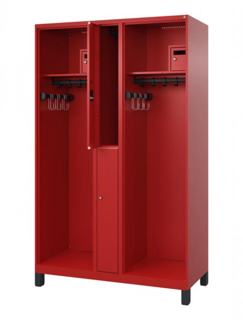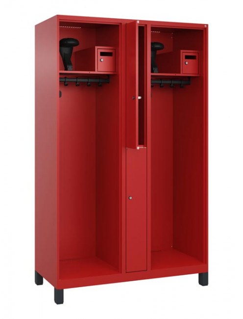 Il offre deux compartiments individuels pour deux utilisateurs, garantissant une organisation claire entre vêtements de service et vêtements civils conformément aux exigences DIN 14092 / DGUV.