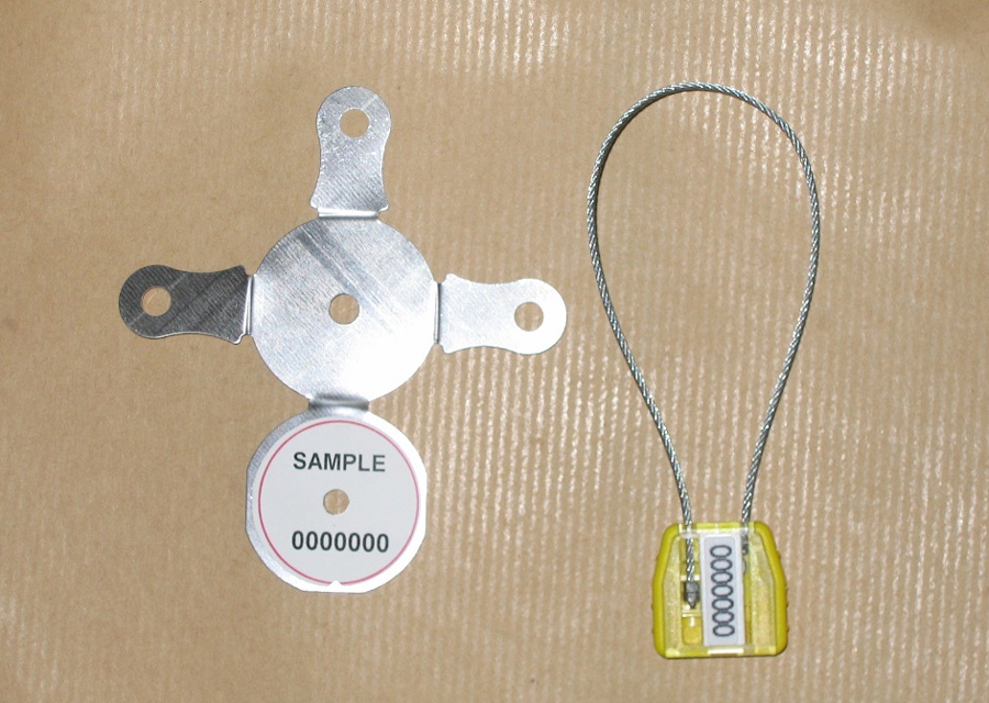 Set composé d'un scellé câble rouge et d'un feuillard métallique repliable pour sécuriser les caisses et palettes.