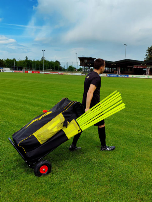Ce chariot d'équipements sportifs est conçu pour facilité le transport des équipements d’entraînement et des ballons.