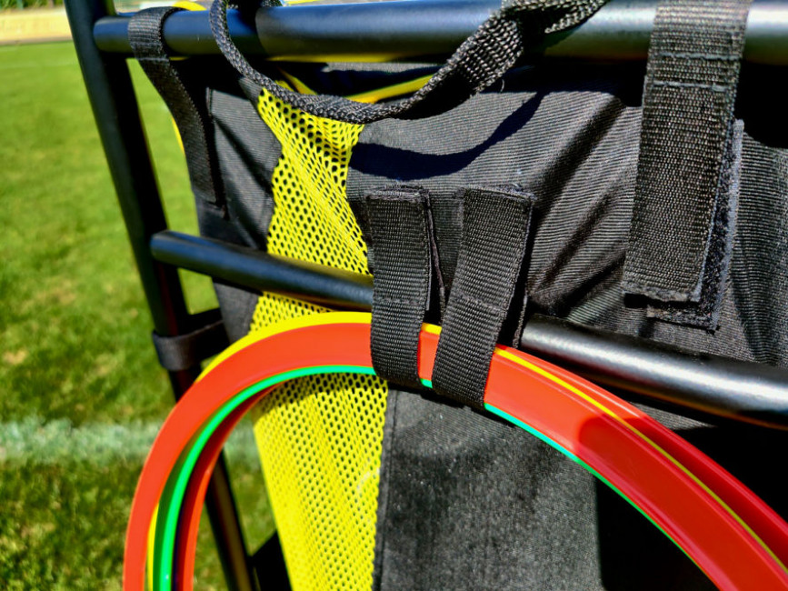 Il est composé de crochets de fixation avec velcro permettant d’y accrocher les cerceaux et différents matériels d’entraînement.