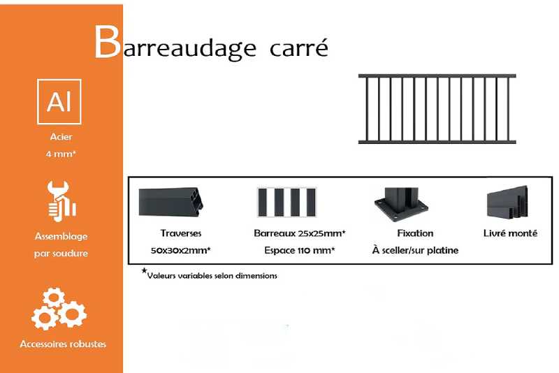 Fabriqué en acier avec un barreaudage carré de 25 mm, ce produit s'adapte harmonieusement aux portails et dispose d'un design classique qui s'intègre dans divers environnements.