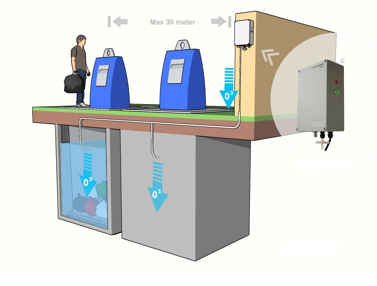 Il réagit par la destruction complète les mauvaises odeurs à la source par l’intrusion du gaz d’ozone dans le container.