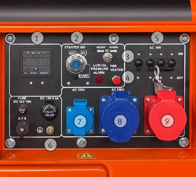Le panneau de commande dispose d'un affichage numérique pour surveiller la tension, la fréquence et les heures de fonctionnement.