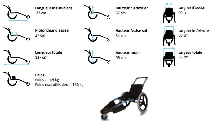 - Barre de poussée : Tube aluminium anodisé avec une poignée recouverte de mousse améliorant le confort de l’accompagnateur.