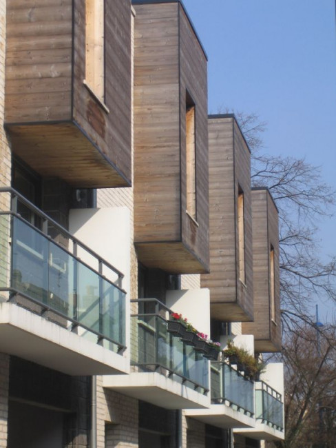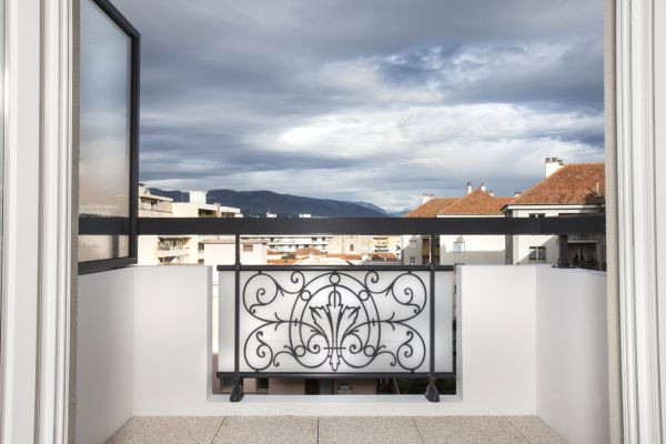 Le garde-corps est constitué de montants en aluminium et de vitres feuilletées filantes avec reflet.