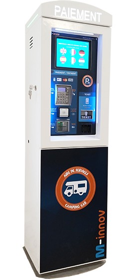 - Pré-paiement : Le client sélectionne sa langue, effectue le choix « vous arrivez » puis choisit la durée de son séjour ainsi que les services désirés (parking, WIFI, électricité, eau ...). Le client obtient un unique code utilisé pour entrer/sortir et accéder aux services. Il peut ainsi entrer et sortir autant de fois qu’il le souhaite. Deux à trois tickets sont imprimés : ticket avec le code, une facturette et ticket horodateur (option).