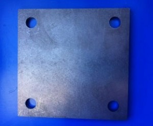 Platines carrées = 100x100x5 / 100x100x10 / 150x150x10 / 200x200x10 / 250x250x10, percées de 4 trous de diamètre 12 mm ou 14 mm.