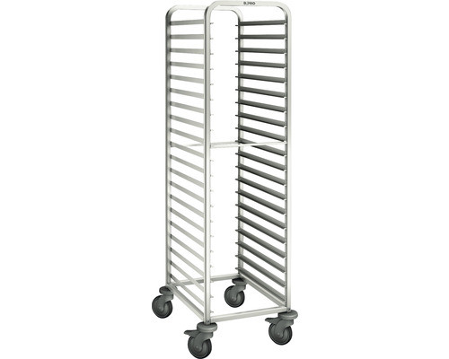 Inox Capacité : 20 plaques de four 600 x 400 mm Capacité de charge totale : 200 Kg Roues ø 125 mm en plastique ou acier galvanisé