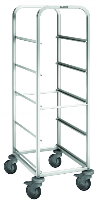 Acier inoxydable Capacité : 5 bacs Euro E2 600 x 400 x 200 mm Espacement des supports : 5 paires 245 mm Capacité de charge : 125 kg Roues ø 125 mm en plastique ou acier galvanisé