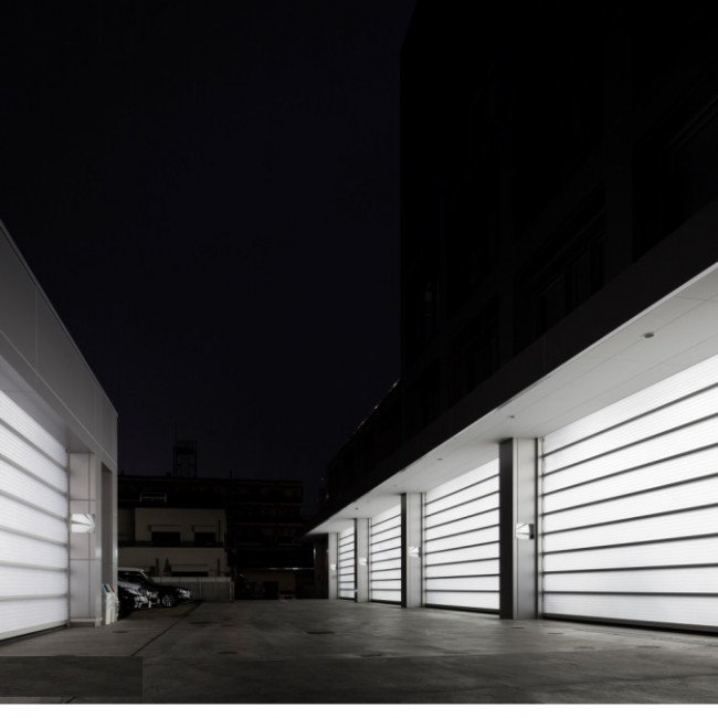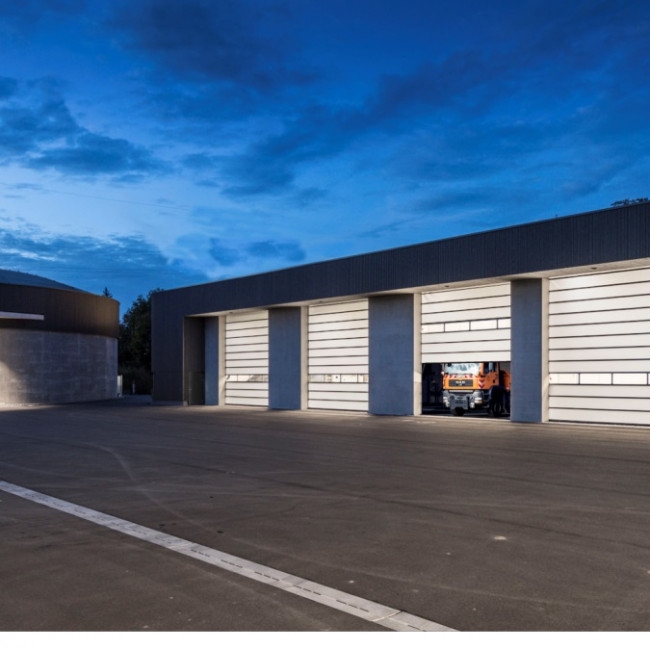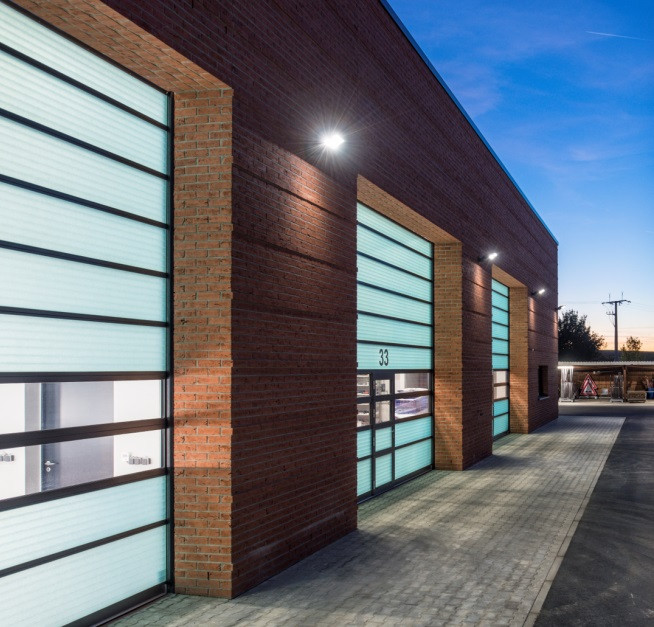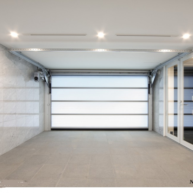 - À l'ouverture, les sections de porte sont détournées sous le plafond et convoyées à l‘intérieur du hall