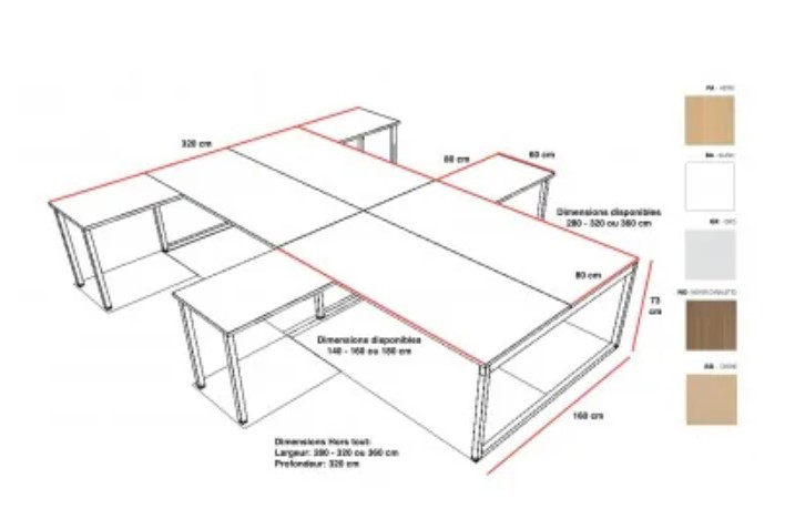 - Bureau 4 personnes AVEC retour :Longueur 280,320, 360 cm, Profondeur: 320 cm, Hauteur 73 cm