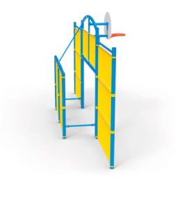 La partie basket intègre un cercle en fer plat et un panneau 1/2 lune PEHD 1200 x 900 x 20 mm avec hauteur réglable à la pose de 2,60 m à 3,05 m pour s’adapter selon l’âge des utilisateurs et le niveau de jeu attendu.