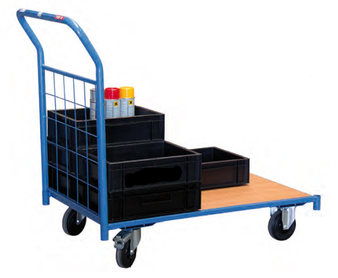 Très maniable grâce à c’est 4 roues en caoutchouc Ø 125 mm, 2 fixes + 2 pivotantes à frein disposées en rectangle.