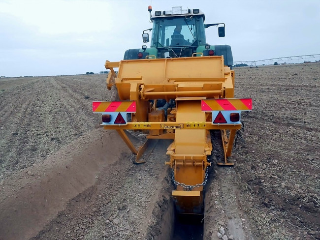 La trancheuse Valentini RA 1100-1500 permet de travailler dans le sol jusqu’à 145 cm de profondeur, elle se décline en deux largeurs de travail 450 et 550 mm. Il faut un tracteur de 300 à 400 CV pour l’entrainer. Son rotor tourne à 178 tours/min et elle pèse suivant la version 6800 ou 7200 kg.