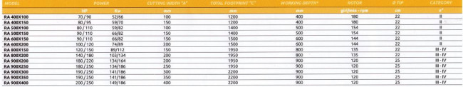 La trancheuse Valentini RA-L 400-900 permet de travailler dans le sol jusqu’à 90 cm de profondeur, elle se décline en 17 modèles de tailles différentes, profondeur de travail allant de 400 mm à 900 mm et largeurs de travail allant de 100 mm à 500 mm. Il faut un tracteur de 70 à 250 CV pour l’entraîner suivant le modèle. Son rotor tourne de 120 à 180 tours par minute suivant le modèle.