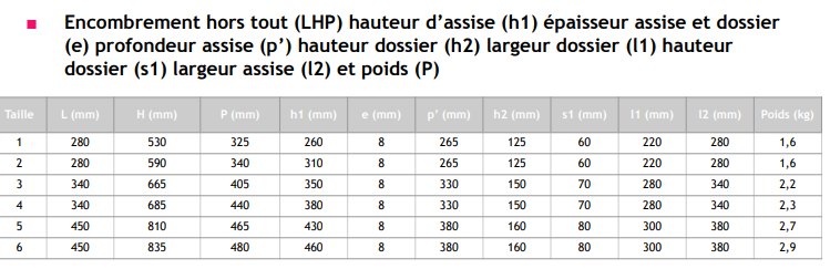 Notre chaise ZANA est disponible en 6 tailles, avec une hauteur d’assise de 260 mm à 460 mm.