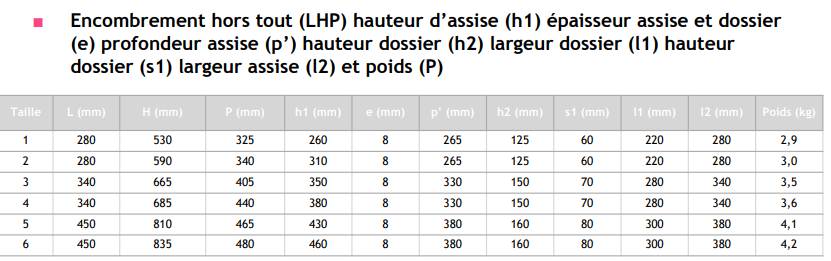Hauteur d’assise : 260, 310, 350, 380, 430 et 460 mm