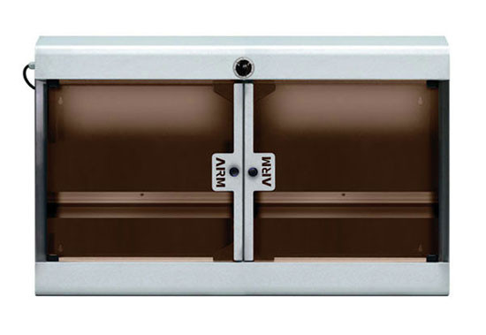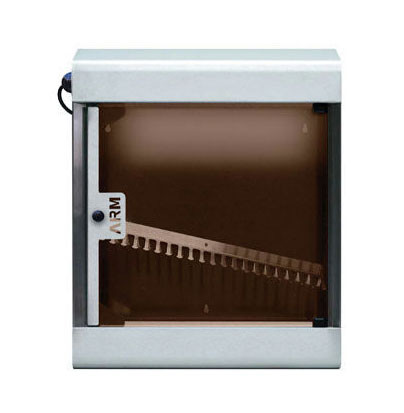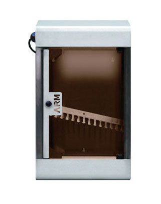 Cette armoire offre une capacité de stérilisation de 10 ou 20 couteaux, avec une porte en plexiglas à fermeture magnétique pour un usage pratique.