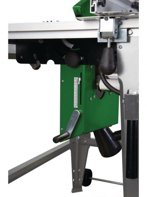 - Lame de scie pivotante, inclinable au degré près grâce au volant de réglage et à la graduation de 0 à 45°