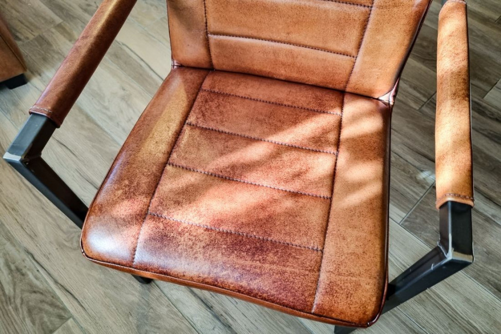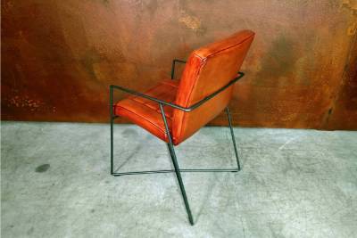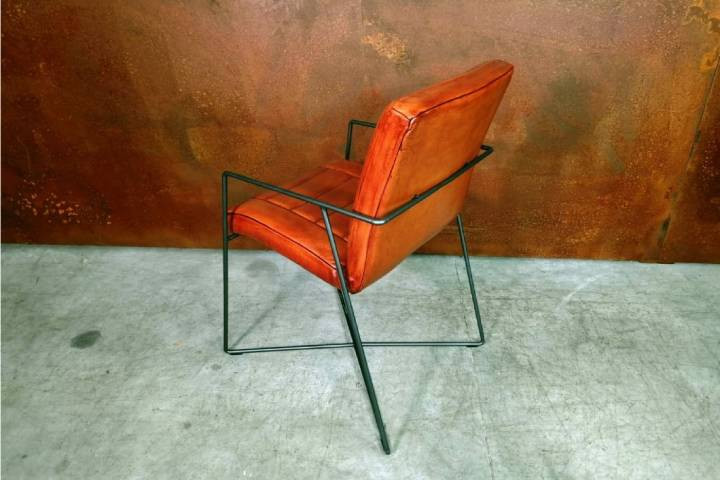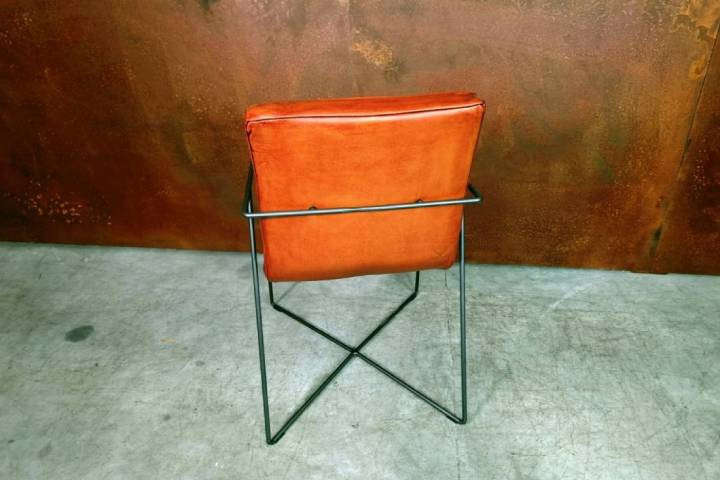 Cette chaise au design original et soigné, pensée pour les intérieurs exigeants, marie un cuir de veau pleine fleur d’origine française à une structure en acier brut au style industriel affirmé.