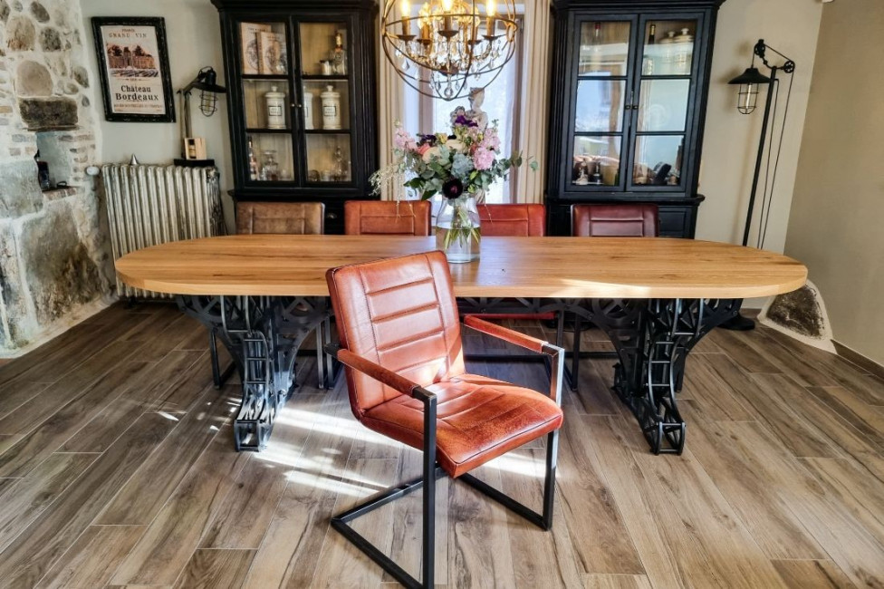 Les coutures en échelle, les manches gainées de cuir et les soudures apparentes soulignent un mobilier design qui s’intègre dans :