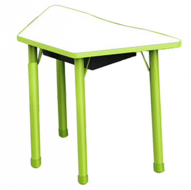 La table scolaire trapèze est dotée d’un plateau en panneau de particules de 18 mm d’épaisseur, recouvert d’un revêtement mélaminé résistant à l’usure, à l’humidité et aux variations de température. Les chants sont en PVC injecté, avec bords arrondis pour limiter les risques de blessure. C’est un mobilier scolaire modulable sécurisé et durable.