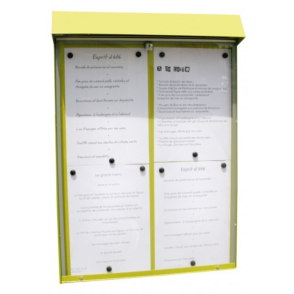 Cette vitrine porte-menu murale est destinée pour usage extérieur, avec une capacité d'affichage pour 4 pages .
