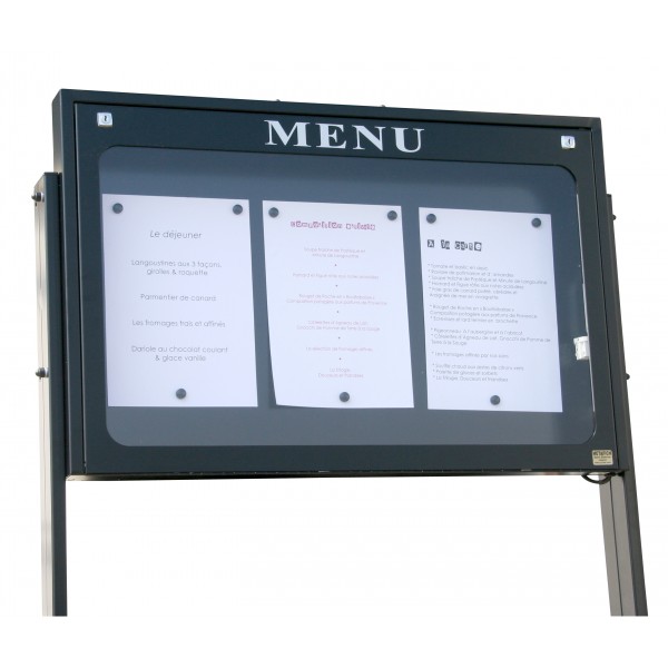 Ce porte menu 3 pages de 810 x 65 x 530 mm a une dimension d'affichage de 730 x 430 mm et un éclairage LED.