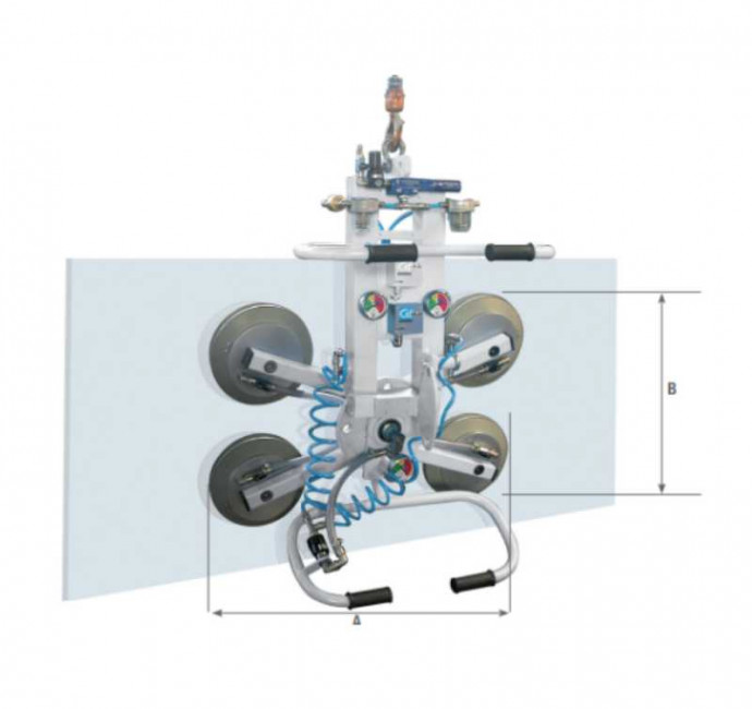 Ce modèle propose une configuration ajustable : selon la taille et le poids du verre, vous pouvez adapter le nombre de ventouses utilisées. Chaque ventouse est montée sur bras amovible, avec un positionnement flexible permettant d’optimiser l’équilibrage de la charge.
