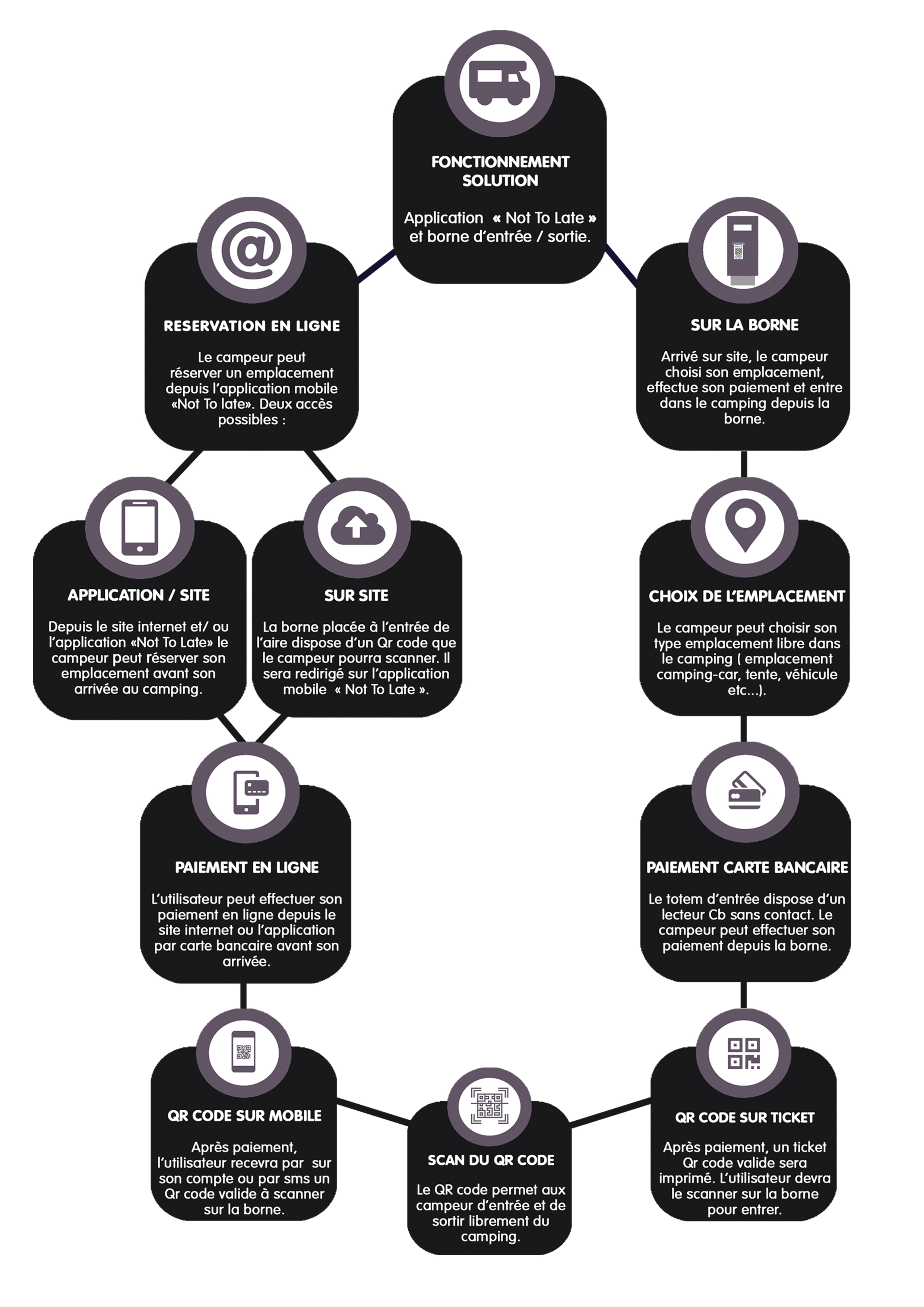 - Grâce au lecteur de QR code intégré au totem, le campeur devra simplement scanner ce QRcode pour ouvrir la barrière, entrer et sortir librement du camping. Les campeurs seront informés, sur le ticket, qu’ils devront se rendre à l’accueil le lendemain afin de régulariser leur séjour.