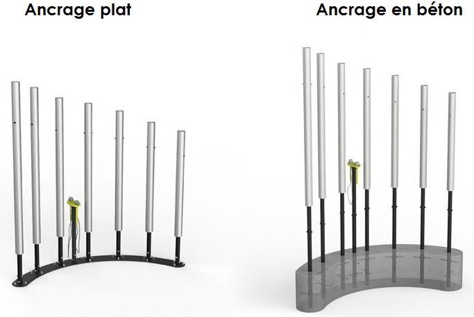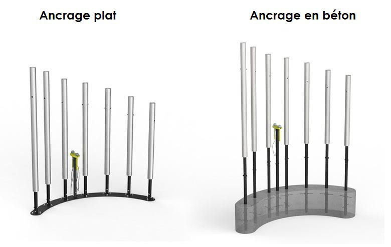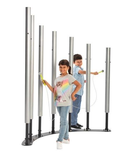Conçu pour les parcs, jardins publics, aires de jeux et espaces collectifs, il invite petits et grands à créer des mélodies simplement en frappant ses tubes métalliques de différentes longueurs.