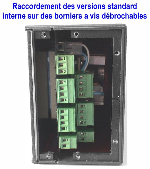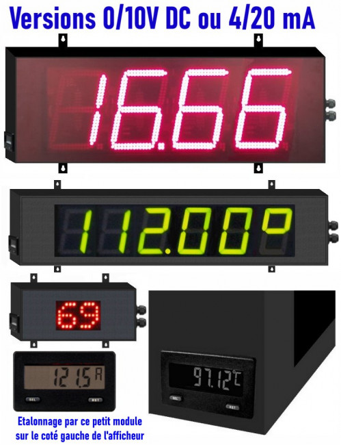Process 0/10VDC ou 4/20mA, BCD, compteur, chronomètre, thermomètre, hygrométrie, tachymètre.