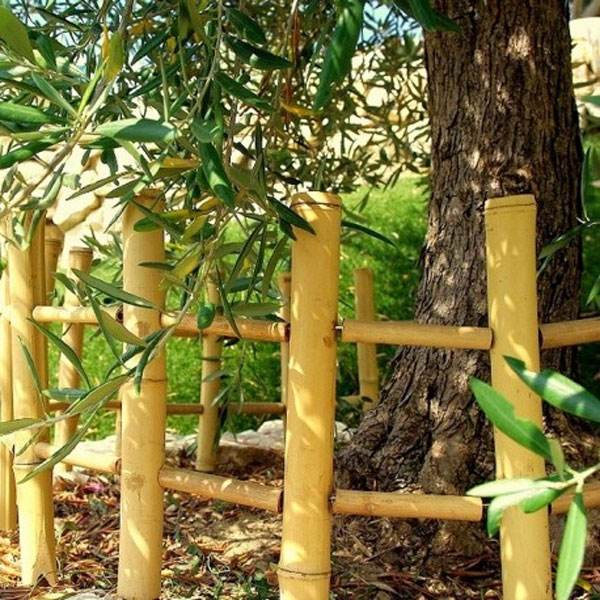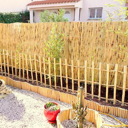 De fabrication artisanale, nous vous proposons des produits réalisés à partir de tiges de bambous pleine. Des tiges verticales de 3/4 cm de diamètre, traversées horizontalement par un fil de fer galvanisé dissimulé dans des morceaux de tiges de bambous de 2 cm de diamètre et d’une longueur de 40/45 cm, créant un espace entre les tiges verticales. Il est à noter qu’une tige verticale tous les 50 cm (environ) est plus longue et taillée en biseau pour vous permettre de planter l’ensemble dans un sol meuble (sable, terre). Esthétiques et originales, vous pourrez les utiliser en séparation non-occultante, délimitation de chemin, entourage de massifs,
