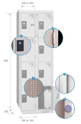 Avantages : ✓Porte-étiquette plastique adhésif ✓Corps métallique avec renfort de structure ✓Porte munie d’assourdisseurs pour votre confort ✓Ventilation optimisée au dos sur toute la hauteur ✓Fermeture par moraillon porte-cadenas, serrure à clé, à code multi-utilisateurs ou monnayeur ✓Système anti dégondable exclusif et breveté, porte à débattement 180°