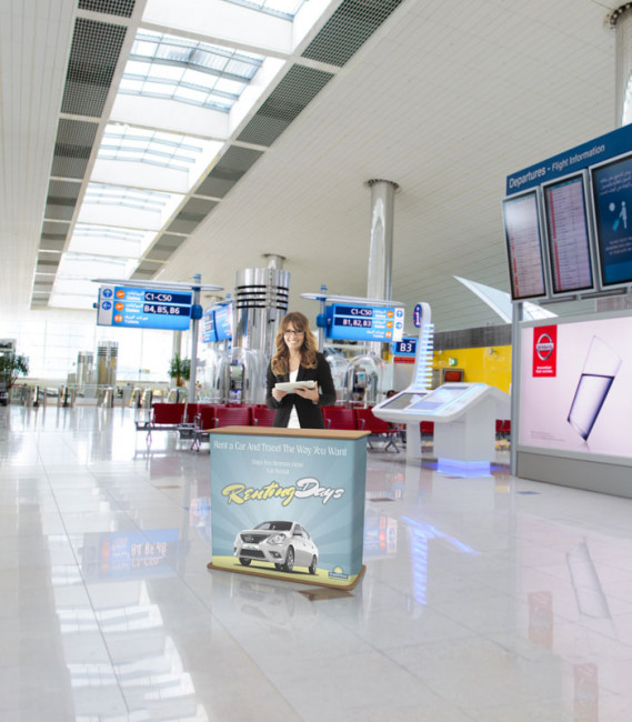 26/03/2019Comptoir d"accueil pliable avec sac de transport et impression d"un visuel sur le tissu